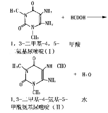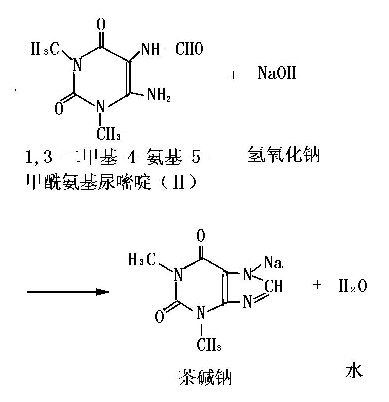 以甲酸將(I)甲酰化得(II),后者在堿性條件下脫去一分子水,閉環(huán)形成茶堿鈉。